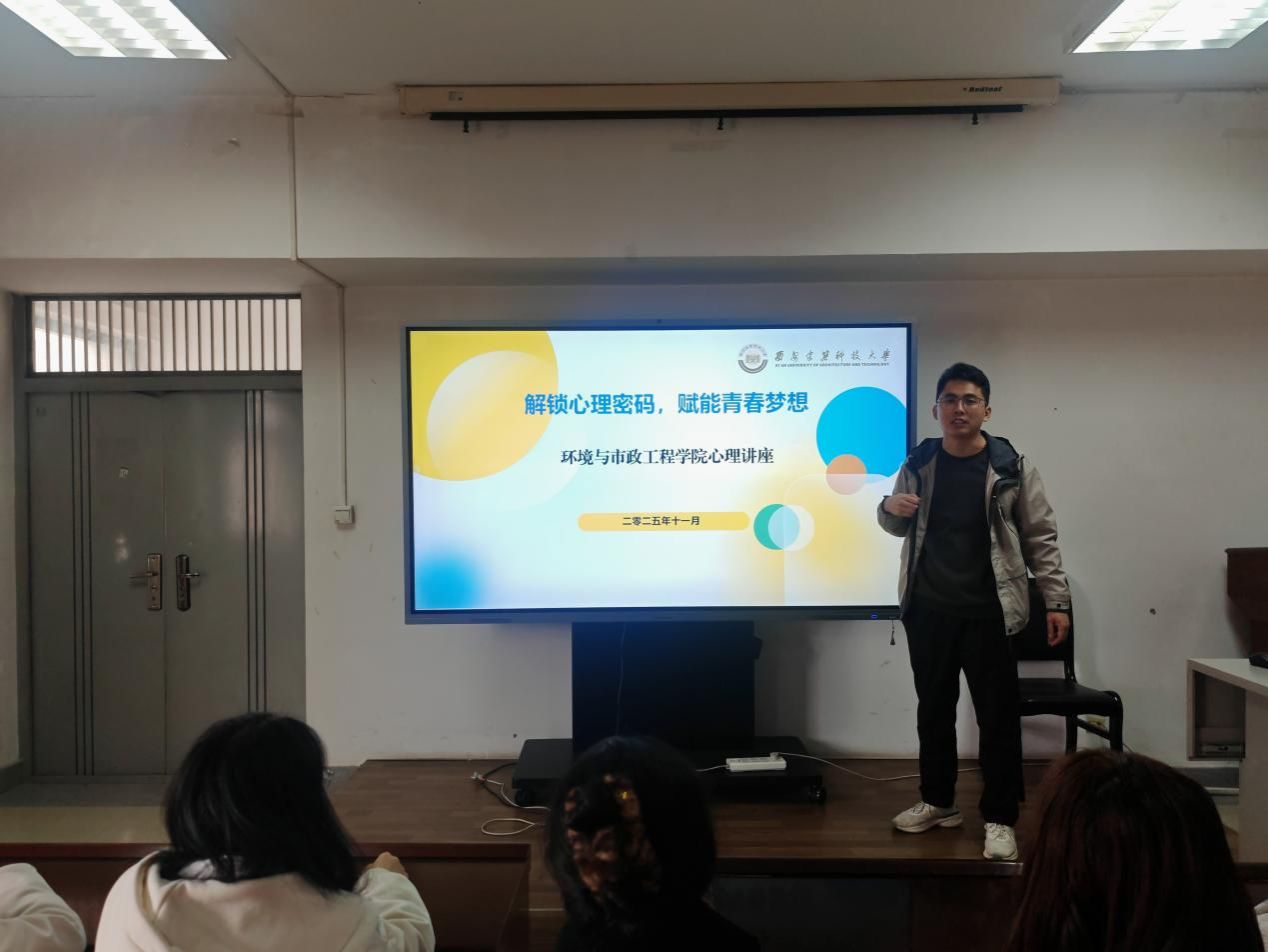 为加强大学生心理健康教育,引导学生以积极心态规划学业与人生,2025年11月14日,环境与市政工程学院2023级本科生辅导员薛福举老师为2023级本科生开展了一场题为“解锁心理密码,赋能青春梦想”的心理健康专题讲座。