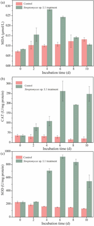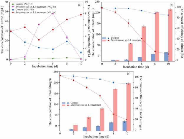 研究采用了一株具有好氧反硝化能力的放线菌——链霉菌LJH-12-1(L1),通过其分泌的胞外活性物质展现出显著的杀藻效果。实验表明,L1菌株的胞外滤液对铜绿微囊藻的杀藻率高达85%,并能在杀藻过程中同步去除96.05%的硝酸盐氮,显著提高了氮循环功能基因的相对丰度。