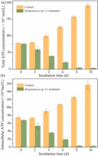 图3.对照组和实验组中(a)总ATP,(b)细胞内ATP的变化。