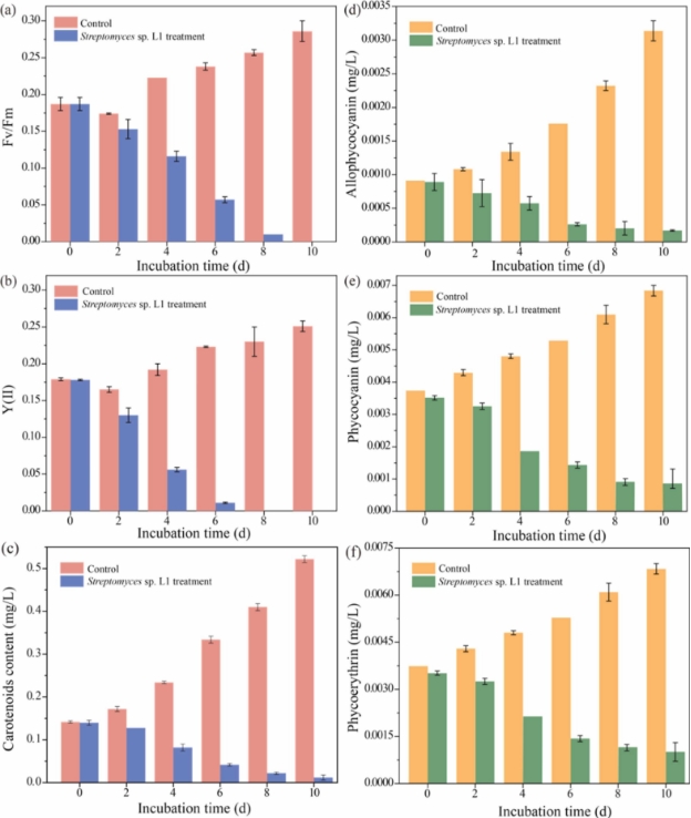 图1.在用链霉菌菌株的上清液处理铜绿微囊藻期间观察到LJH-12-1(L1)和对照组的(a) Fv/Fm、(b) Y(II)、(c)类胡萝卜素、(d)别藻蓝蛋白、(e)藻蓝蛋白和(f)藻红蛋白的变化。