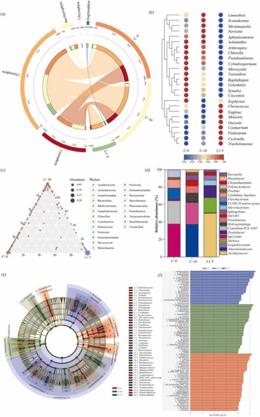 图7. (a)处理前后城市湖泊藻类群落组成在门一级的变化;(b)处理前后藻类群落组成的热图分析;(c)门一级细菌群落组成的丰度分布和差异三元图;(d)细菌群落组成在属一级分布的柱状图;(e)原水处理前后细菌群落组成的线性判别分析效应大小(LEfSe)分析。线性判别分析(LDA )显示差异丰富的分类群;(f)显示细菌群落组成的系统发育结构的分支图。