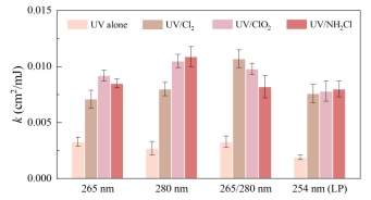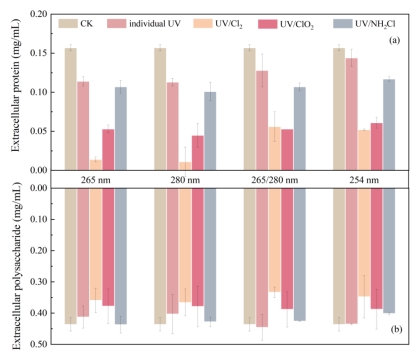 本研究选择紫外发光二极管联合氯基消毒剂(氯,二氧化氯、氯胺)工艺,探究紫外发光二极管与氯基消毒剂的组合消毒对黑曲霉生物膜的控制效能,并与传统低压紫外联合工艺消毒效能进行对比。研究表明,单独紫外对黑曲霉生物膜的消毒控制非常有限,而当紫外发光二极管联合氯基消毒剂之后,黑曲霉生物膜的控制效果得到显著性增强。其中,280 nm紫外发光二极管联合氯胺消毒剂可以实现对黑曲霉生物细胞的更高的对数灭活。在此工艺下,黑曲霉生物膜细胞膜通透性损伤更为严重,细胞内活性氧水平进一步增加,并且可以极大程度降低与黑曲霉生物膜胞外聚合物的反应水平,从而增强了黑曲霉生物膜细胞的灭活。