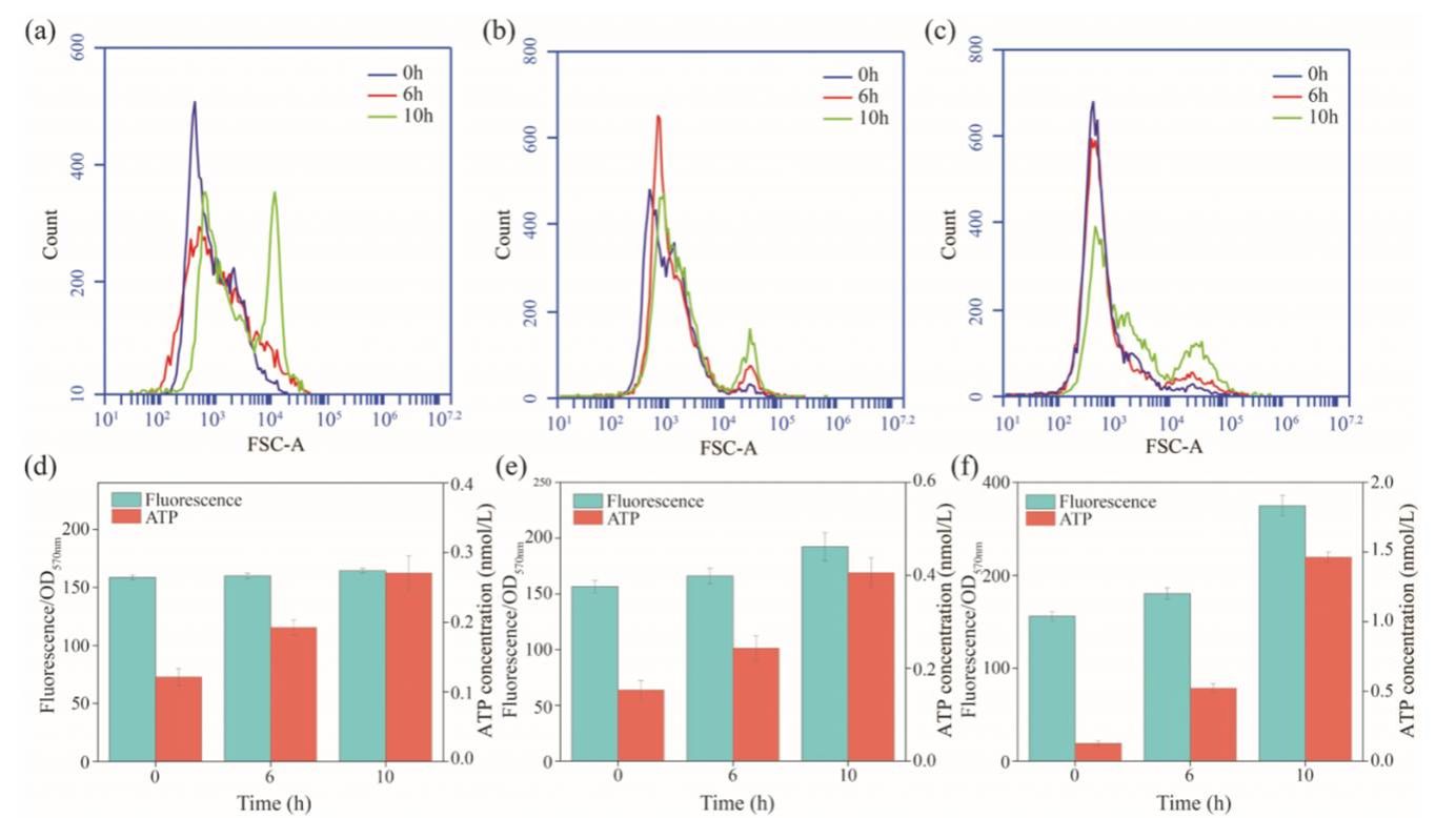 图2. 放线菌孢子在原水中萌发时的FSC、ATP和荧光强度的变化