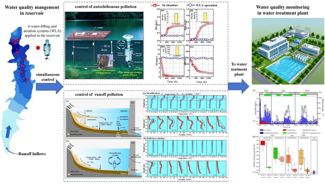 2026-01-13随着水库成为主要饮用水源,内源污染和径流污染已成为下游水处理厂水质周期性恶化的主要原因,实施原位水质改善措施已经至关重要。针对这一问题,本研究为期3年,评估了在水源水库中应用扬水曝气系统(WLA)作为预处理单元应对内源污染和径流污染的可行性,分析了其对下游水厂原水和处理水水质及投加氧化剂量的影响,并提供了实践指导。研究发现,热分层是驱动石砭峪水库内源污染和径流污染特征的核心环境因子,其引发的底层缺氧环境会导致沉积物中还原性污染物的释放。...